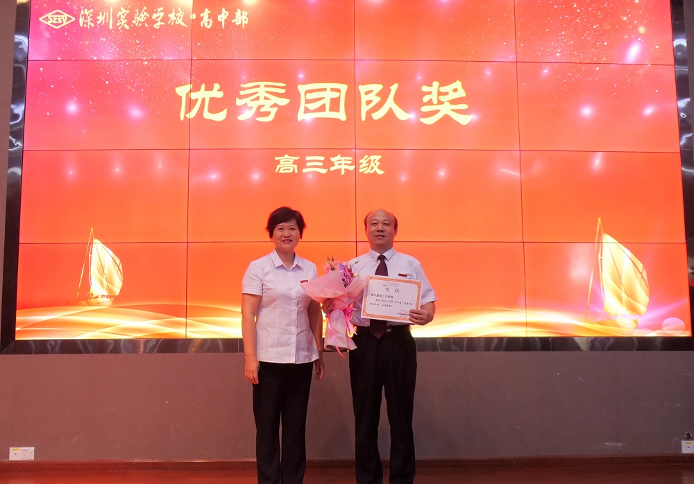“孜孜不倦,细心耕耘,春播粒粒种;群策群力,满腔热忱,秋收片片林。他们潜心钻研,积极进取,创新备考策略;他们勇敢开拓,紧抓落实,融入教育初心。在新高考元年,助力实验扶摇而上,续写辉煌。”杨文艳副部主任为高三年级教师代表颁发“优秀团队奖”。