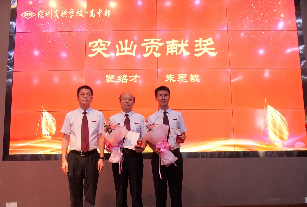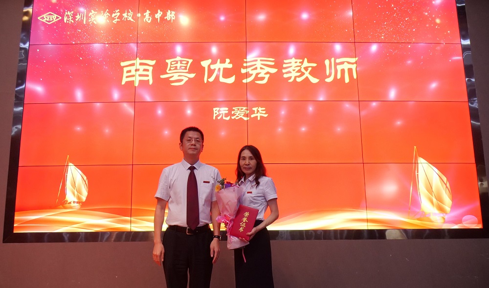 在9月10日下午教工大会上,办公室吴平波主任主持高中部教师节表彰仪式,向辛勤耕耘的老师们真诚地道一声“老师们辛苦了!祝节日快乐!”。阮爱华老师荣获“南粤优秀教师”,朱思敏老师荣获“深圳市优秀教师”,裴绍才、朱思敏两位主任荣获“实验学校突出贡献奖”,李震宇副校长为他们颁发获奖证书。