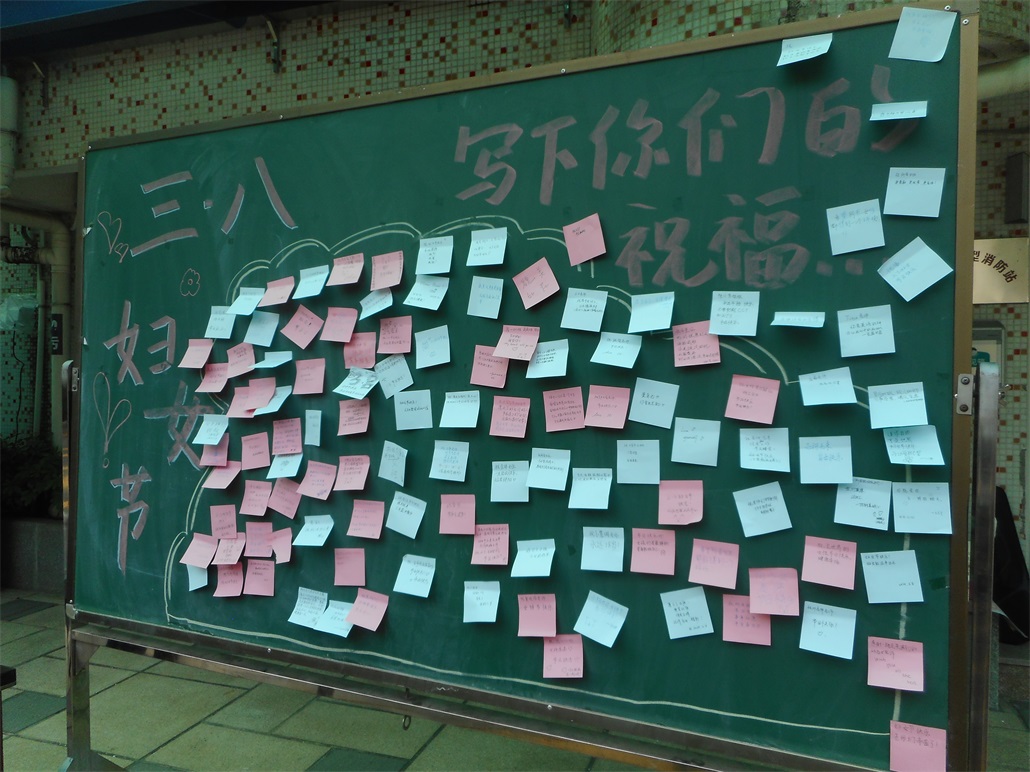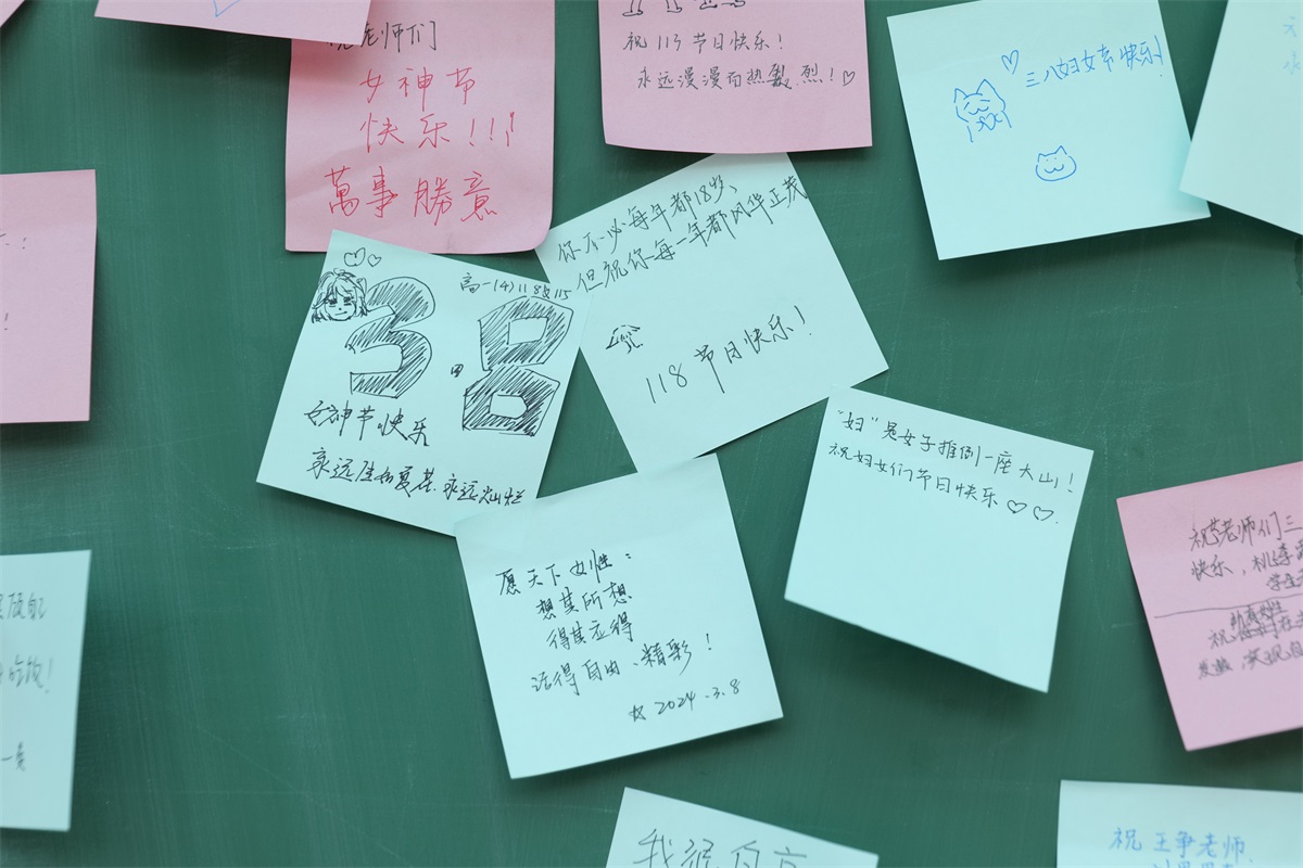 团委学生会成员们在前往食堂的必经之路设下一块大黑板,邀请路过的师生为女生们写下祝福。随着午餐时间的到来,同学们纷纷停下脚步,有的思考片刻,有的挥笔即写。不一会儿,黑板就被各式各样的便签条覆盖,写满了对女生的关心和美好祝愿。这面祝福墙,不仅展现了深实验学子的温暖与创意,更成为了当天校园里最亮丽的一道风景线。