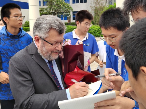 深圳实验学校党委副书记、副校长、高中部执行校长邓旭携高中部处室主任、教师代表热情欢迎杰曼诺夫教授一行莅临高中部,双方在热情友好的气氛中交流座谈、赠送纪念品,我校还介绍实验学校的办学理念和教育教学成果,得到教授的高度赞赏。