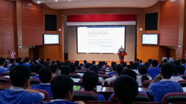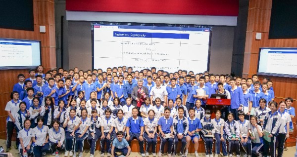 下午4点40分,杰曼诺夫教授步入会场,全体学生报以热烈掌声。杰曼诺夫教授从数学在技术革命中的重要性讲起,指出以数学学科为基础的信息革命将引领当今技术革新,数学将成为更加有力的工具。从法国著名数学家伽罗瓦的成长经历到德国数学王子高斯的故事,从有限域的发明到密码学的实际应用,杰曼诺夫教授幽默风趣,现场始终欢笑不断,氛围热烈而又自由。虽然对于大多数高中生来说,数学是一门比较有挑战的学科,但是教授的讲座深入浅出、举例生动,同学们一直聚精会神、用心领会。