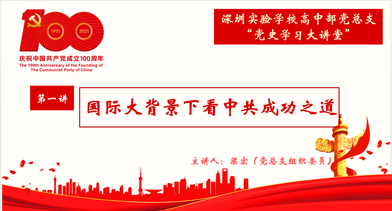 在庆祝中国共产党百年华诞的重大时刻和“两个一百年”历史交汇的关键节点,为了贯彻落实习近平总书记在党史学习教育动员大会上的讲话精神,深入学习党的历史经验,认识历史规律,弘扬党的传统,继4月份深圳大学马克思主义学院副院长徐建华教授的《从党史看中国道路》的讲座后,5月14日,深圳实验学校高中部党总支副书记杨文艳主持开展了“党史学习大讲堂”系列活动第一讲。本次活动由党总支组织委员梁宏担任主讲人,介绍国际大背景下的中共成功之道。