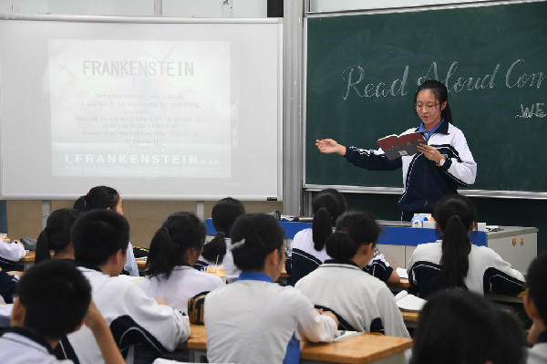 早读开始前,已经有学子开始了自己的“个性化早读”,七点三十五分铃声一响,教室内早读声朗朗。随后一节特殊而精彩的英语演讲诵读课吸引了众多家长的目光,袁友红老师将舞台交给学生。两位学生主持人以流利的英文阐述着活动的意义,七位学子配乐诵读英语名著《弗兰肯斯坦》,小评委们认真打分、点评。在场者纷纷感叹实验学子的英语功底与表达功力。