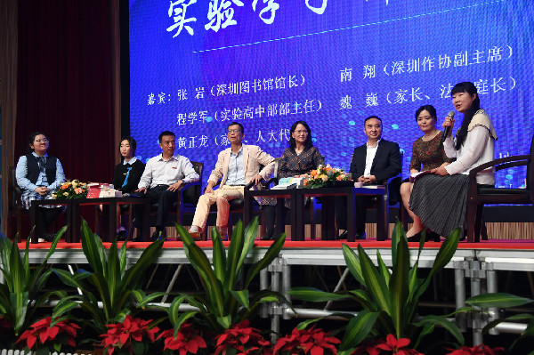 当天下午,由深圳实验学校、深圳图书馆联合主办的“实验学子新书发布会暨读书论坛”在高中部文体中心顺利举办。《记得那时正年少》作者苏岩同学和《红楼造梦局》作者黄子真同学与到场观众分享自身的写作故事和成长经历,深圳图书馆张岩馆长、深圳作协南翔副主席、实验高中部程学军主任,以及苏岩妈妈魏巍女士,黄子真爸爸黄正龙先生出席现场。