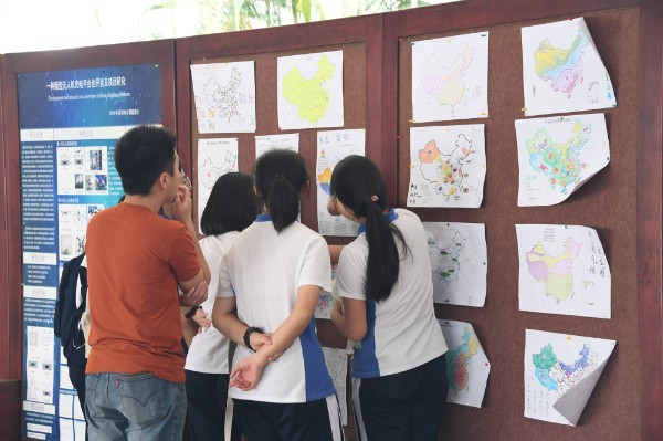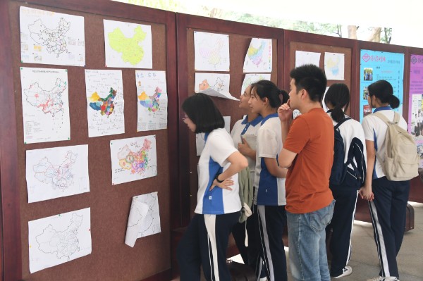 地理学科组组织了高一“手绘地图展”和高二“校园寻宝活动”。两项活动均得到了同学们的热烈欢迎和积极响应。高一年级同学们的手绘中国地图,主题各异,精彩纷呈。不仅绘图科学严谨,而且还给人以较高的审美体验。高二年级校园寻宝活动现场异常火热。校园内随处可见同学们认真研究地图、奋力奔跑的身影。虽然已是汗流浃背,但收获成功的喜悦却是最值得。