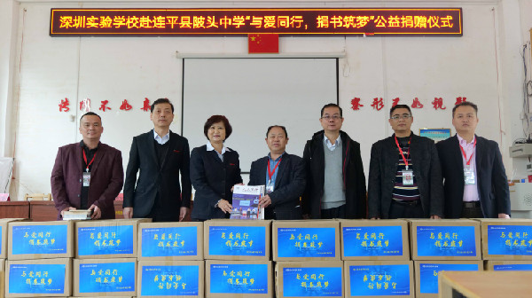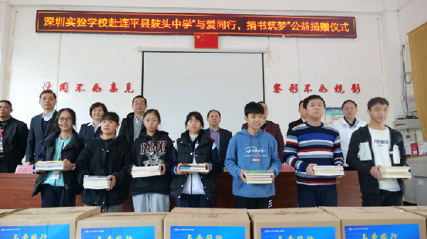 上午课间时间,深圳实验学校高中部赴连平陂头中学“与爱同行 捐书筑梦”公益捐赠仪式在学校礼堂隆重举行。陈平飞校长在讲话中对高中部师生“捐书筑梦”活动表示了诚挚的感谢,表示这些书籍将大大丰富陂头中学的图书资源,为同学们的学习打下良好的基础,也为两校师生的交流开启新的篇章。集团教育教学部李健副主任在讲话中介绍了高中部师生在党员、团员的带领下开展的捐书活动,勉励陂中的同学们坚持梦想,刻苦学习,用优异的成绩回报老师和家长。