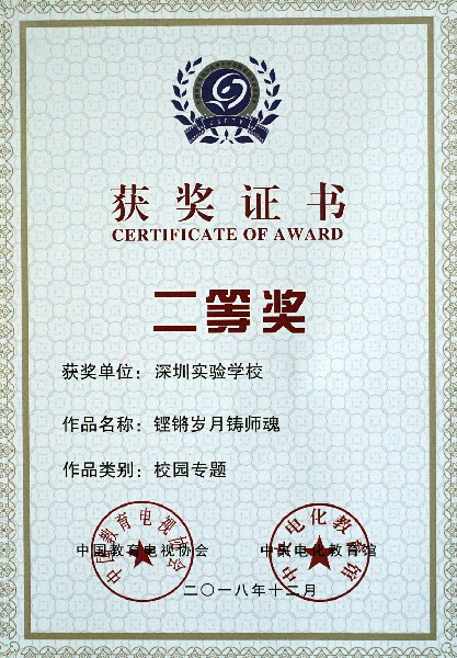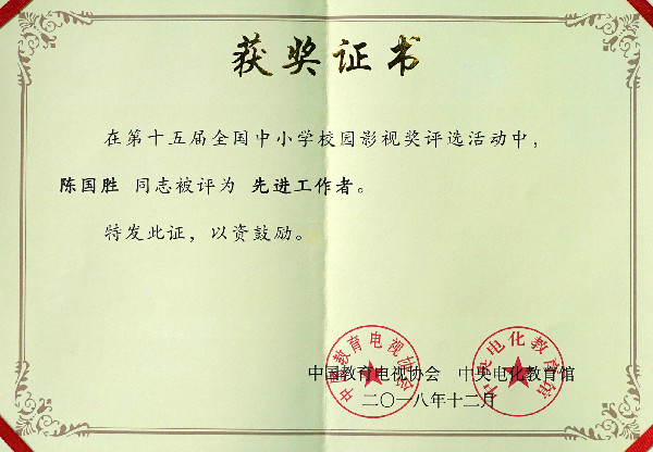 2018年11月29日到12月1日,第十五届全国中小学校园影视奖颁奖大会在河南郑州举行,我校影视中心和花季电视台选送的四件作品中,两件获得全国一等奖,一件获得二等奖,一件获三等奖;陈国胜老师被评为全国校园影视先进工作者。