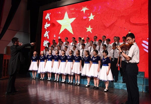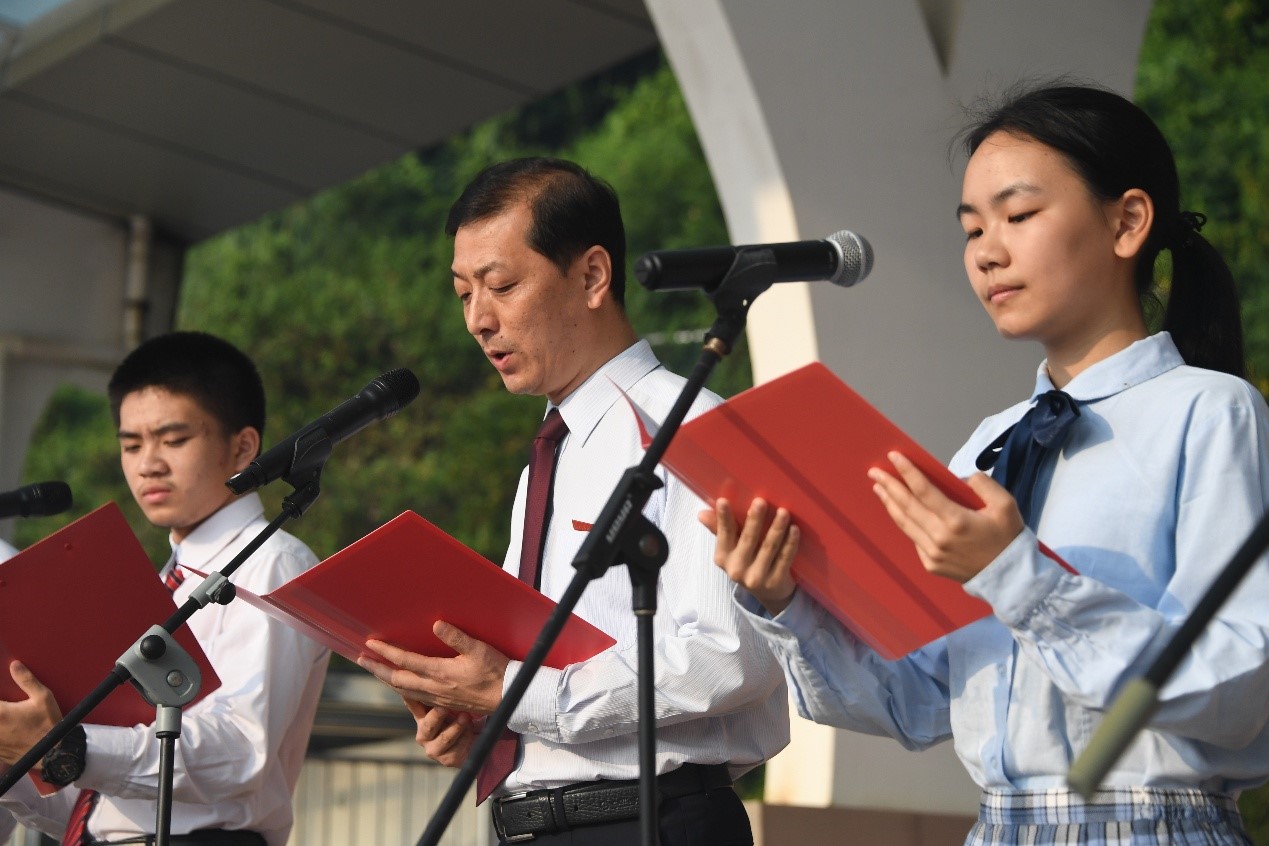 2019年9月30日,深圳实验学校高中部举行庆祝新中国成立70周年主题晨会。高中部全体师生在官龙山下注视着高高飘扬的红旗,为祖国母亲送上自己最真挚的祝福。