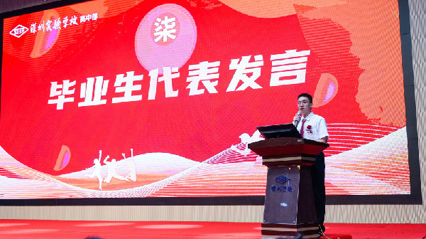 高三(1)班汪宸宇同学作为毕业生代表讲述了他从实验幼儿园到实验小学部、实验中学部、再到实验高中部,一路走来的心路历程:感谢实验老师们的无私奉献,亦师亦友心相印,亦教亦学意相投;感谢实验以爱国主义教育为核心的健全人格教育理念,让同学们树立了正确的人生观价值观,坚定了对中国共产党的信仰、对祖国的热爱;感谢校园里每一个角落,每一朵花草,它们将化作同学们内心最柔软的角落,成为大家一生中最温暖的慰藉。同时,汪同学也期许:明日的我们将用青春的作为书写人生篇章,让实验以我为荣!