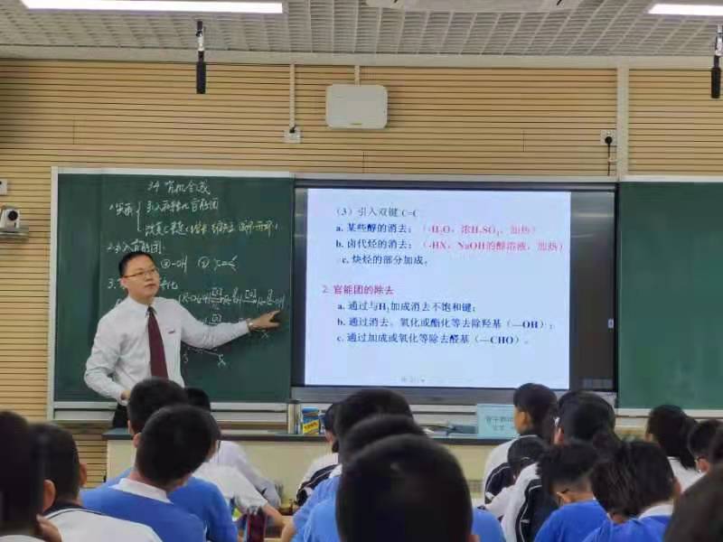 4月20日,高二化学组林进太老师执教了《有机合成》一课。林老师从趣味的有机象形分子引入新课,极大调动了学生的学习积极性,也为后面的有机合成的实质(引入和转换官能团、改变碳链)奠定基础。林老师用典型案例引导学生观察、思考问题,整节课如行云流水,讲练结合,充分体现了“以学生发展为本”的主导思想,重点突出,层次分明,是一节成功的示范课。