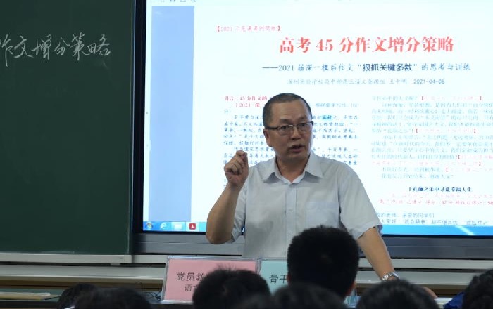 4月8日下午,高三语文备课组的王中明老师率先开课。他以“深一模”作文题以及学生原作和升格作品为例,强调作文审题扣题、思维架构的意识和能力。从写作要求到材料内涵,王老师抽丝拨茧层层深入,明确作文题的写作核心,列举了五大常见问题。在完成作文整体框架建构的基础上,王老师从“引”“议”“提”三个角度引导学生升格作文开头,力求在充分把握写作要求的基础上,形成亮点。