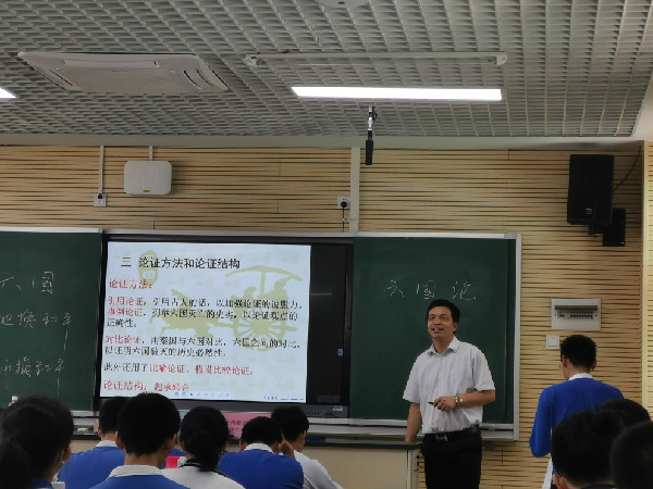 4月22日上午,高一语文备课组的樊春喜老师主讲了苏洵的《六国论》。樊老师是学生心中的“大先生”,学识渊博,谈吐幽默。在教学中,他旁征博引,深入浅出,从疏通文本,落实双基、史论的阅读方法、论证方法和论证结构等维度引导高一(1)班的同学们层层剥笋,步步推进,渐入佳境。他洒脱的讲课风格深深吸引学生专注课堂,细读文本,为优质高效的课堂教学做出了典型的示范。
