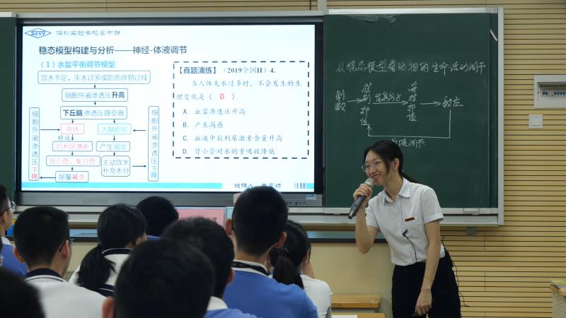 4月14日下午,高三生物备课组的朱雯颖老师以《基于“稳态”的动物生命活动调节》为课题,从“稳态”的基本概念导入,构建维持稳态的调节模型,从神经调节、体液调节、免疫调节三个方面对稳态模型进行分析,并结合高考真题进行讲解。朱雯颖老师帮助学生将稳态模型应用于不同的情境信息题,指导学生学会运用稳态模型理清题干信息,通过层层提问,一步步引发学生思考,师生共同得出答题思路,使学生的文字表达更具逻辑性,充分培养学生的科学思维。