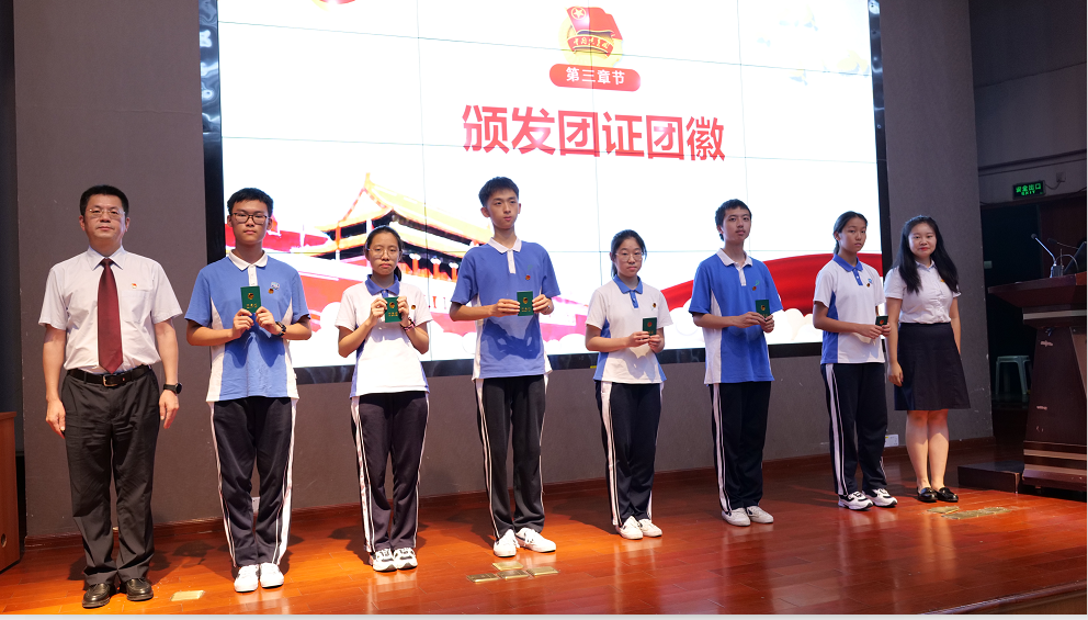在庄严的国歌后,团委书记赵雪老师宣读关于《关于批准黄睿扬等46名同学加入共青团的决定》。李震宇书记、赵雪老师为新团员代表颁发团员证,佩戴团徽。