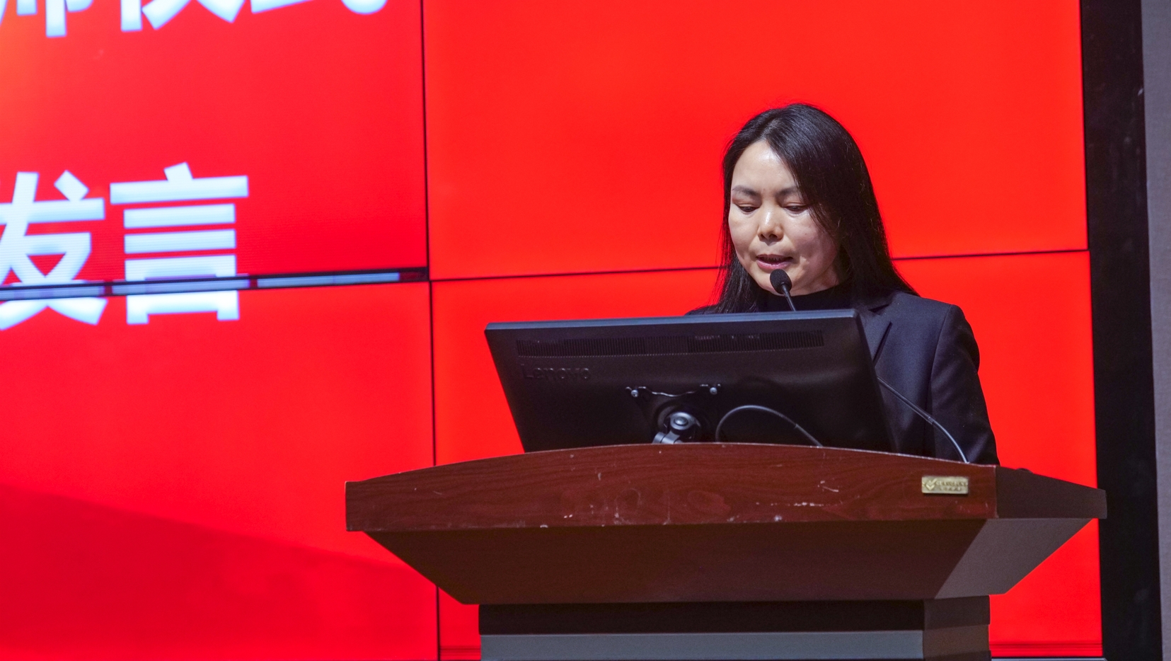 高一地理组的陈可欣老师作为徒弟代表发言。陈老师代表全体徒弟向实验的老教师们表达深深的敬佩,向为年轻教师们提供宝贵学习机会的校领导表示诚挚的感谢,向以后将在工作中悉心指导的师父们致以崇高的敬意。