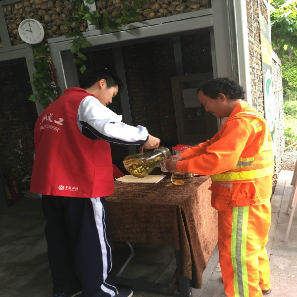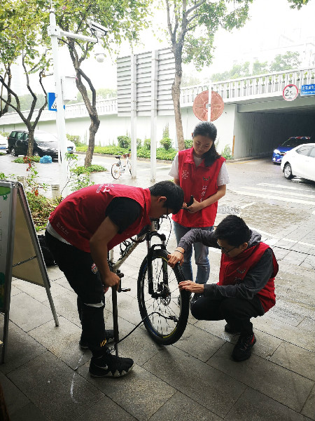 驿站里,晨练的大叔喝着义工递过来的清新的菊花茶,露出了满意的微笑;环卫工人辛苦了,来驿站歇歇脚,喝杯茶,心情顿时舒畅;看到一个大叔的自行车骑不了了,义工们马上上前帮忙检查,发现链子掉了,然后又发现轮胎没气了,于是找出打气筒,帮大叔打气,经过一番努力,自行车被修好了。大叔高兴地给了他们大大的两个赞。这就是我们心灵手巧,不怕脏不怕累的义工!