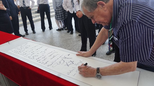 讲座结束后,Aaron Ciechanover教授热情提议与全场师生合影,并为深圳实验学校光明部题词,给全校师生送上诚挚的祝福。题词内容为:“致深圳实验学校全体师生:愿一切顺遂,美梦成真;奉献社会,报效祖国!”