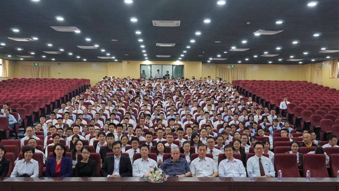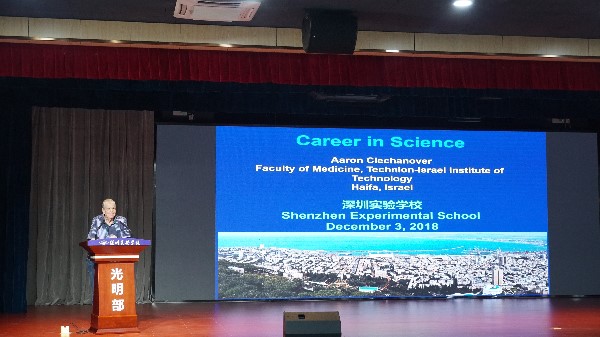 12月3日下午,以色列人文和自然科学院院士、美国国家科学院外籍院士、诺贝尔化学奖获得者Aaron Ciechanover教授做客深圳实验学校光明部“专家大讲堂”,为全体师生献上了一场内容详实、异彩纷呈的英文讲座。本次讲座是光明部“专家大讲堂”的首场讲座,也是光明部成立以来为学生提供的第一场专家报告。光明部高一年级全体师生齐聚报告厅聆听讲座,集团教育教学部、集团办公室领导莅临本次活动。