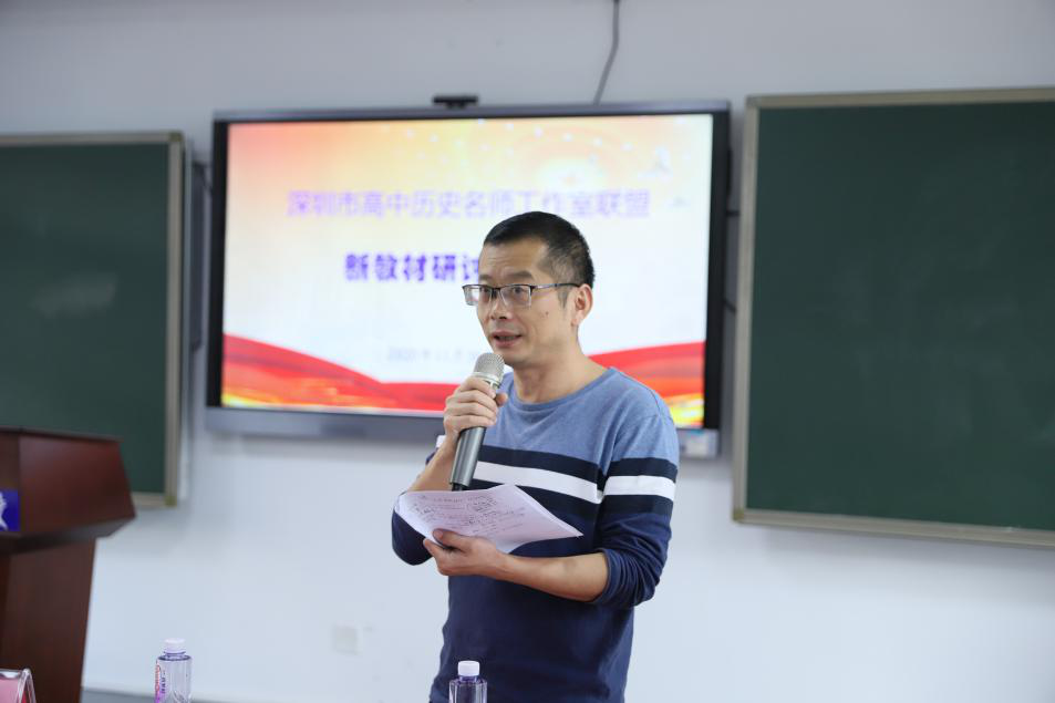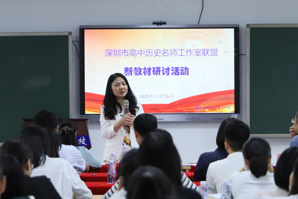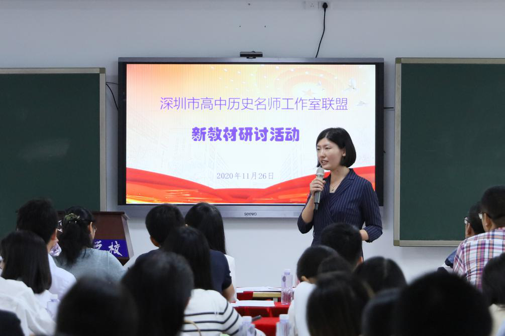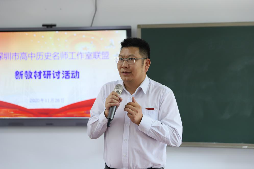 2020年11月26日下午,在学校领导及教务处的大力支持下,深圳市高中历史名师工作室联盟新教材研讨活动在光明部隆重举行。深圳实验学校光明部田祚鹏执行校长、学生处王果然主任、历史学科主任李静主任及全体历史科组成员参加了本次研讨活动。李静主任担任研讨会主持。应邀出席本次研讨活动的嘉宾有深圳市历史学科兼职教研员陈箐、深圳市吴磊名师工作室、深圳市黄斌胜名师工作室、深圳市姜少梅名师工作室、深圳市南山区名师程晓波老师、红岭高中双学锋老师及骨干教师、宝安第一外国语李瑞锋老师及历史学科骨干教师、深圳大学附属中学范立红老师及历史学科骨干教师、深圳市科学高中何冠宾老师及历史学科骨干教师,以及各区教师代表。