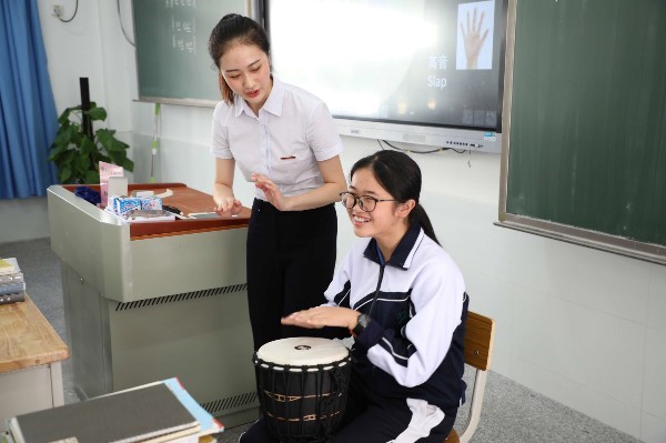 吴老师首先邀请同学们观看非洲鼓乐表演,接着请大家在具有代表性的乐曲——《布隆迪鼓舞》声中体会其鲜明的节奏特点和热情奔放的音乐情绪。她还将非洲鼓带入课堂,让学生通过实践,体会非洲鼓带来的独特魅力。