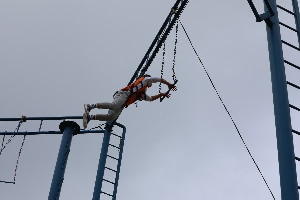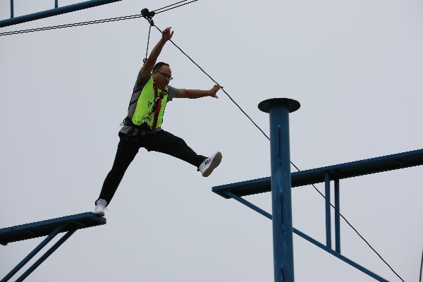 经历了紧张而饶有趣味的团队展示后,开始了青年教师本次素质拓展的第二个项目——空中抓杠。这个项目需要青年教师穿戴好安全衣、固定好专业登山动力绳,徒手爬至距离地面10米高的一处支撑板上,然后通过调节平衡,纵身跳跃抓住前方悬空的单杠,随即由教练通过高空项目保护措施帮助参与者降回地面。高空抓杠的惊险之处在于需要参与者克服自身的心理障碍,磨砺勇毅的品质,敢于突破自我,最终迈出关键的一步。令人欣喜的是,全体青年教师在彼此的鼓励、帮助下,全部参与并成功的克服高空带给人的恐惧感,最终顺利完成该项目。