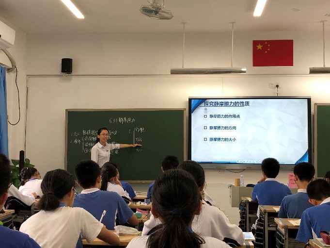 2018年11月8日上午,光明部物理学科吴盼盼老师的见面课在高一(5)班的教室里精彩开讲。课堂一开始,吴老师以小游戏“抓泥鳅”为导入,围绕静摩擦力的“产生条件”、“方向”、“大小”三部分内容展开。吴盼盼老师充分挖掘教材以外的教学资源,通过演示各种对比实验,加深学生对静摩擦概念的理解;运用自制的毛刷教具使得静摩擦力的方向显化,帮助学生突破难点。