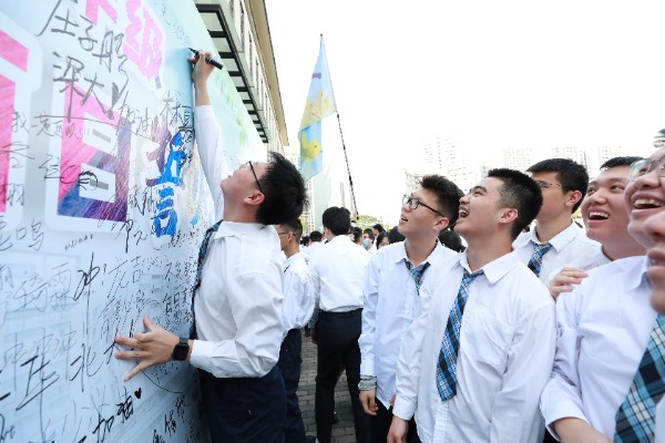 他们跨过寓意为金榜题名的状元门,两侧是为他们喝彩、给予他们鼓励、陪伴他们共同奋斗一起圆梦的老师,与他们一一击掌,为他们加油呐喊!大会结束,高三的同学们来到“百日誓师”签名圆梦墙前写下自己的名字与目标,在照片墙前合照留念。
