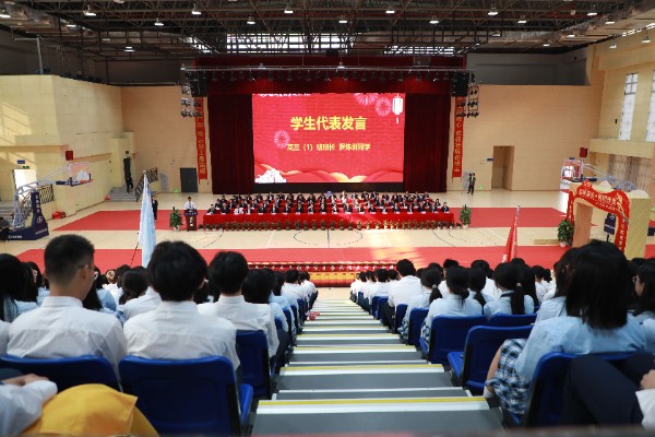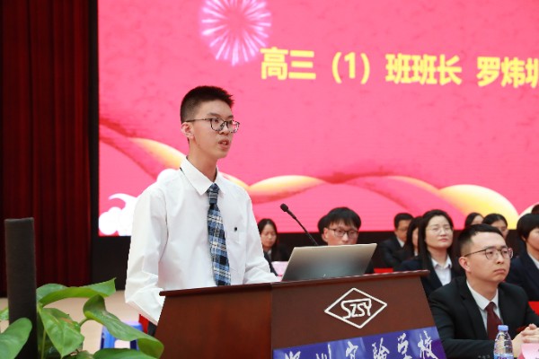 共青团员、高三(1)班罗炜圳同学作为学生代表进行发言。他从刚刚结束的深一模考试切入,用数据向大家展示了高考“千军万马过独木桥”的残酷性,但他认为这种残酷性却又蕴含了公平性,它让每个考生都能通过自己的奋斗拼搏有所收获。