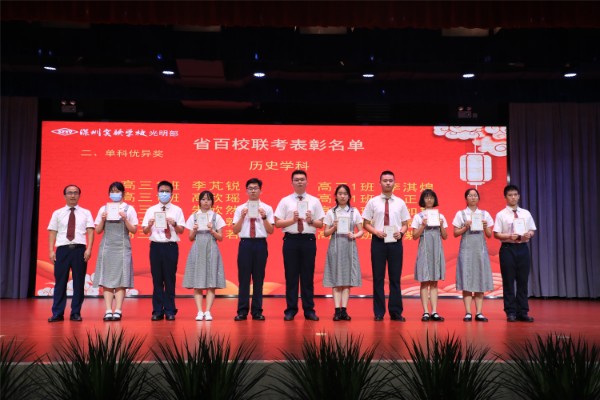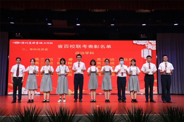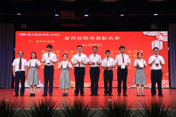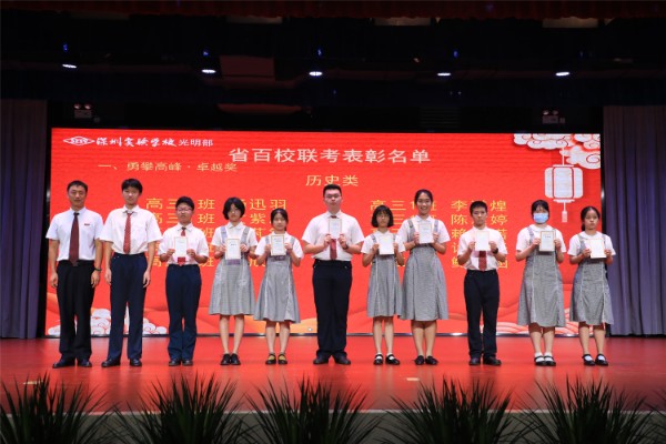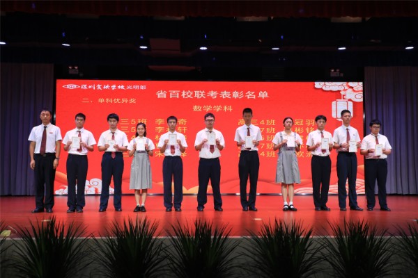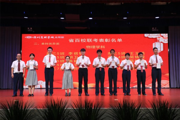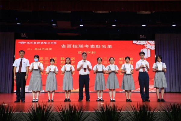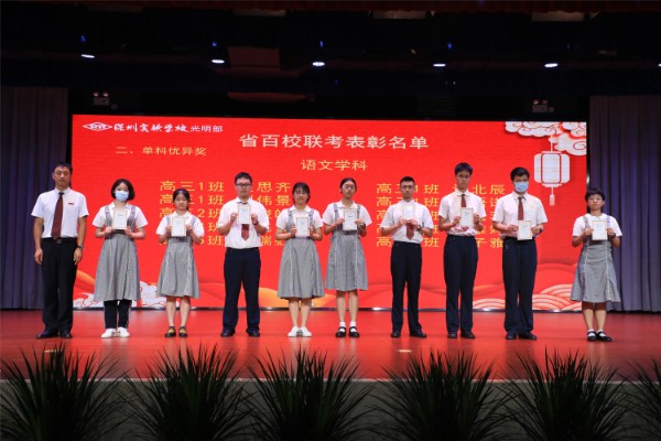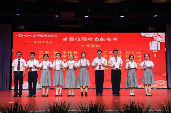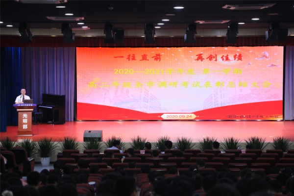 2020年9月24日下午,光明部报告厅灯光闪烁,屏幕火红,在如雷贯耳的掌声中,主持人周向东老师宣布:高二年级全市调研考试表彰大会正式开始。深圳实验学校光明部徐少云副部主任,学生处王果然主任、程继承副主任,教务处吕正军副主任,高二年级吴川主任及全体师生参会。