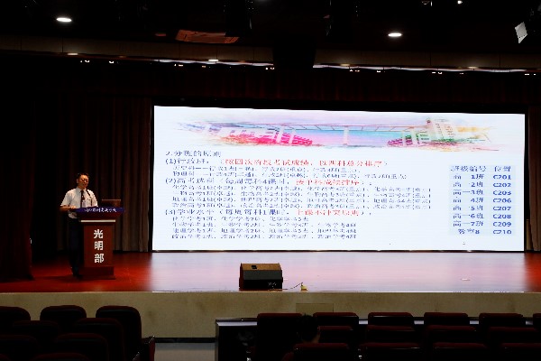 在多方的共同努力下,光明部的选科走班工作得以顺利开展。5月12日晚,教务处彭修和副主任在报告厅为光明部高一年级全体学生作了一场题为《一挑二选,你追我赶;殊途同归,花开彼岸》的报告,深入浅出地解释了选科分班的原则及不同层次班级的独特优势,为下一阶段同学们的走班上课提出了要求及展望。