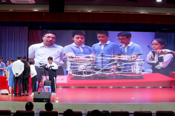 活动现场还实现了实时转播,小球是否能在同学们的巧手下,通过重重机关,顺利回到终点现场比赛呢?这让现场所有观众屏息凝神地注视着舞台和大屏幕。最后,高中部刘焱锋老师给大家讲述了实验校友张云飞的故事,鼓励大家像他一样勇于探索,勇于创新。