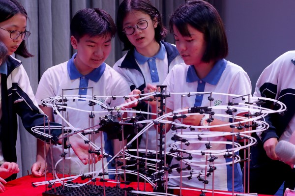 “过山车设计大赛”由高一年级物理吴盼盼老师主持,另外,邀请自高中部的三位重量级嘉宾——陈宏、朱文辉、刘焱锋三位老师也对学生进行了深入指导。同学们需要在规定时间内,将搭好的过山车按照比赛规则,进行现场改进。