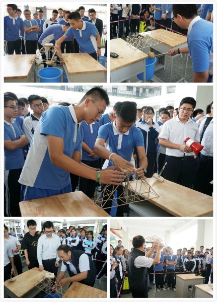 “桥梁模型承重比赛”由高一年级物理郝瑞锋老师主持,同学们各显其能,通过自己对于土木结构的理解和桁架的力学分析,制作出了自己认为最为稳定的桥梁模型。经过近两小时的激烈角逐,高一(3)班黄绍霖、周宇洋两位同学合作设计的桥梁模型,以总质量24kg,单位质量承重1.0526kg/g的成绩赢得冠军,并创造了光明部的桥梁承重赛记录。