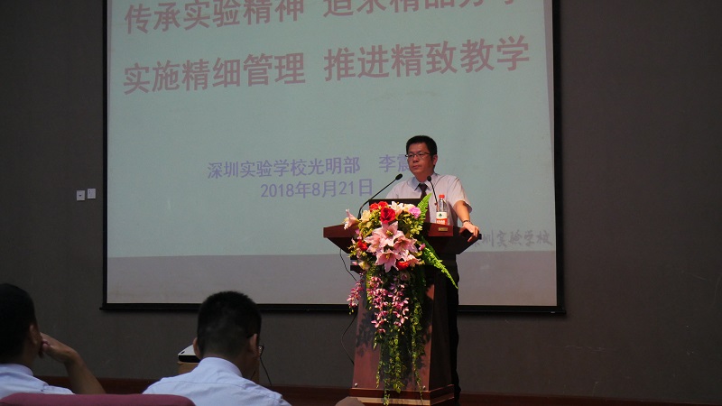 8月21日上午8时,李震宇部主任做了《传承实验精神,追求精品办学;实施精细管理,推进精致教学》的演讲,是为此次培训的先声。李主任从校园概况、管理团队谈起,向大家详细解读了深圳实验学校的办学文化。随后,李主任勉励全体教职员工,要拿出“创业精神”来面对光明部的建设,就是要以必胜的信心和勇气,敢于吃苦、勇于拼搏的干劲,精诚合作的信念,三者合力,共同谱写深圳实验教育集团的又一辉煌诗篇。