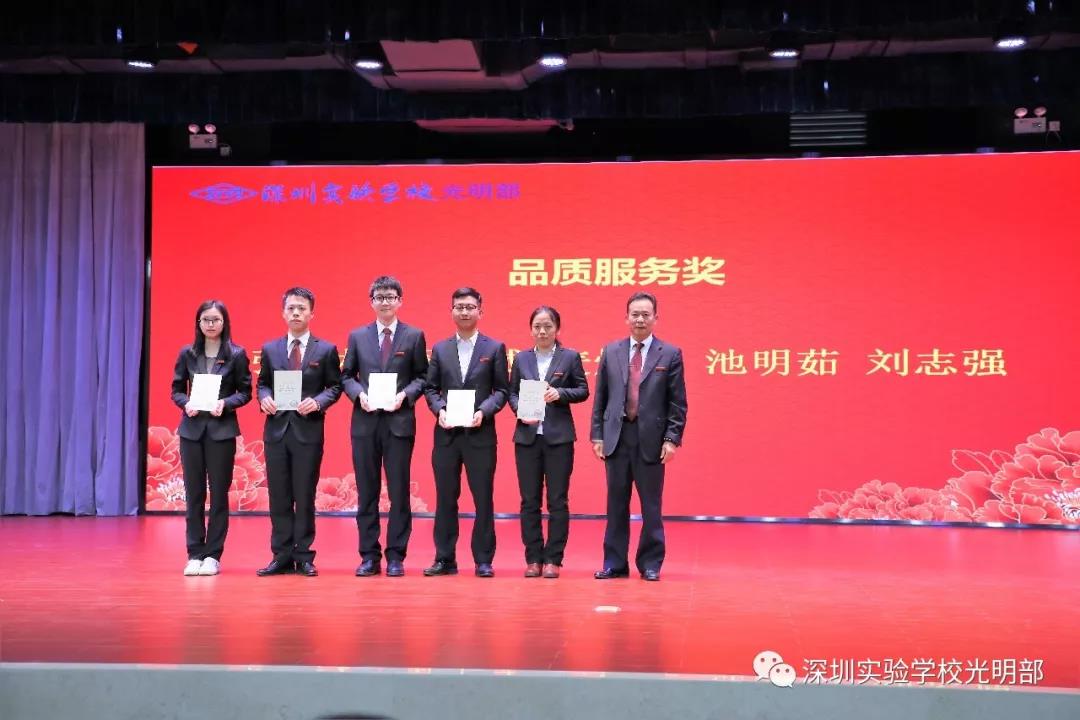 张宝林、周代威、麦焕文、池明茹、刘志强等五位老师,荣获“品质服务奖”,总务处张其龙主任为获奖老师颁奖。