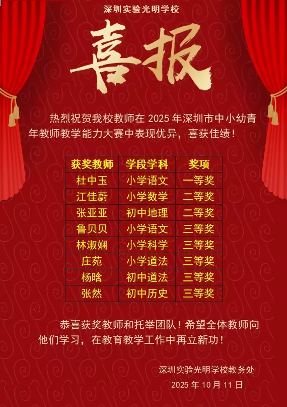 致敬并祝贺每一位获奖教师,感谢你们以热爱与坚守,为校园注入温暖而强大的教育力量。这一份份荣誉既是对老师们过往辛勤付出的褒奖,更是激励全体实光教育人继续前行的号角。未来,我校将持续为教师搭建成长平台、赋能专业发展,期待老师们在教育教学之路上绽放更多光彩,以师者担当谱写学校教育事业的新篇章!