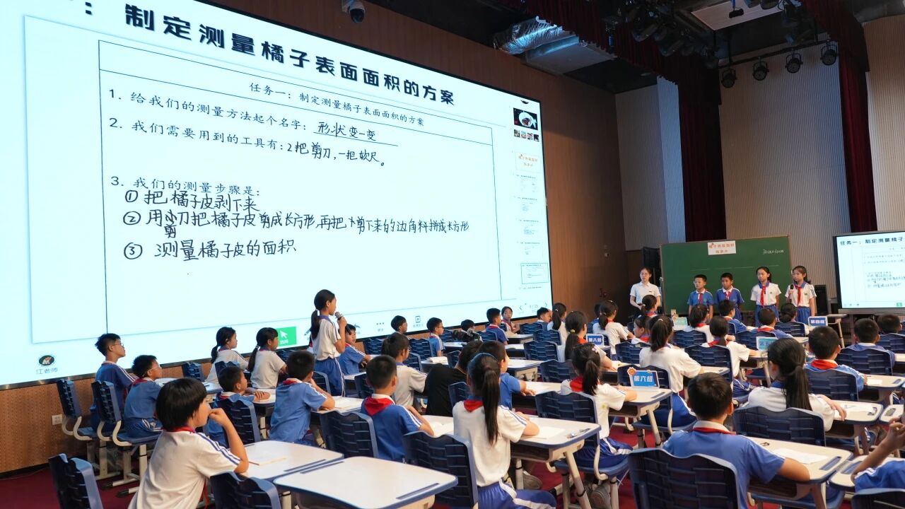 深圳实验光明学校江佳蔚老师在《橘子表面面积有多大——测量不规则图形面积》研讨课上,以陈皮制作这一生活情境抛出“用50个橘子制作陈皮,晾晒时需要多少个30cm×30cm正方形晾晒筐”的核心问题,引领学生围绕“制定测量方案—实践验证合理性—优化测量方案”的子任务链,最终生成了成果“测量橘子表面面积的初步方案和优化方案”。学生通过小组合作、动手操作,自主探索了“数方格”“贴纸覆盖”“称重”“转化成基本图形”等多样化测量方法,深度感悟了转化思想,在解决实际问题的过程中,既体会到数学与生活的紧密联系,又培养了问题解决能力与创新思维。