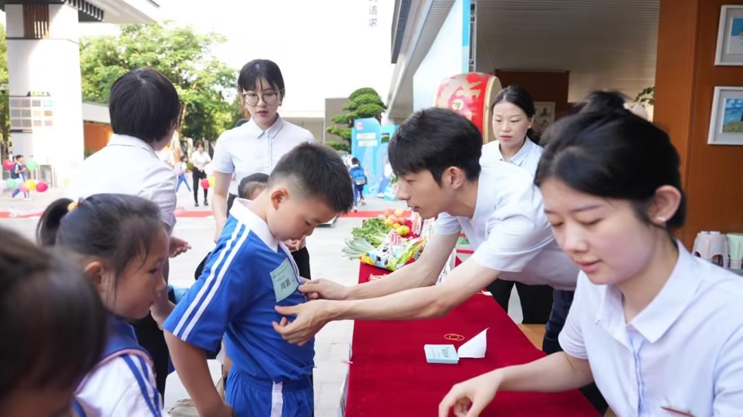 走过成长门,“摸意头”环节让孩子们眼前一亮。一敲小鼓,愿孩子们“一鸣惊人”;摸一摸桔子,盼“大吉大利”;碰一碰苹果,祝“平平安安”;握一握棒棒糖,愿“身体棒棒”;再摸芹菜与大葱,祈“勤勤恳恳”“聪明伶俐”。简单的动作里,满是学校对孩子们的美好祝福,也让孩子们在趣味中感受入学的喜悦。