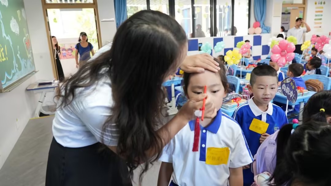 回到教室,朱砂启智环节温情上演。伴随悠扬的实验校歌,班主任们手持朱砂笔,在每个孩子的额头正中点上一抹红痣。“痣”通“智”,这轻轻一点,是希望孩子们从此“眼明心明,好读书,读好书”,在知识的海洋里开启智慧之旅。