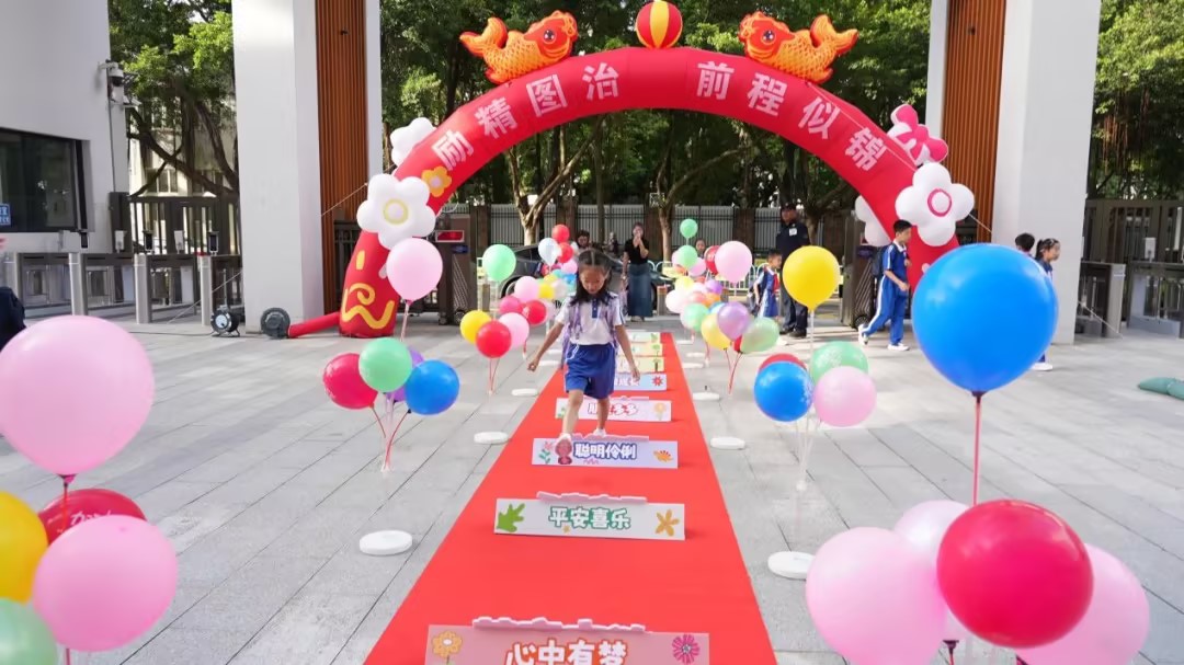 南门的红毯早早铺开,10个写满美好祝愿的栏板依次排开——“聪明伶俐”“平安喜乐”“学业进步”“心中有梦”……孩子们牵着家长的手,有序跨过一个个栏板,每一步都满是期待,每一句祝福都藏着学校对孩子们的满心期许,从此,他们正式开启小学新生活!