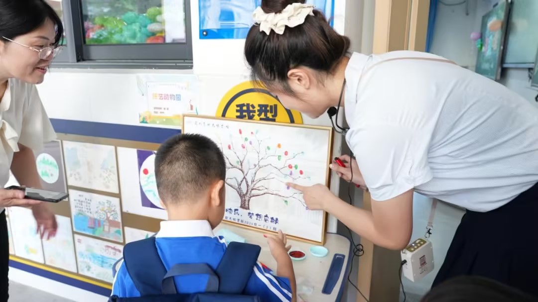 各班教室门口,学校提前准备好的“班级树”静静等候。孩子们挑选喜欢的印泥颜色,在光秃秃的树枝上按下自己的指纹——红色像花朵,蓝色似叶片,不一会儿,“班级树”就变得生机勃勃。这一个个小小的指纹,是孩子们融入班集体的第一步,象征着未来将与伙伴们携手,共建温暖的班级家园。