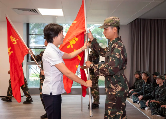 倪娟副校长郑重地将旗帜交到营地教官手中,红色的旗帜在风中猎猎作响。这面旗帜不仅是信任的传递,更是责任的交接。