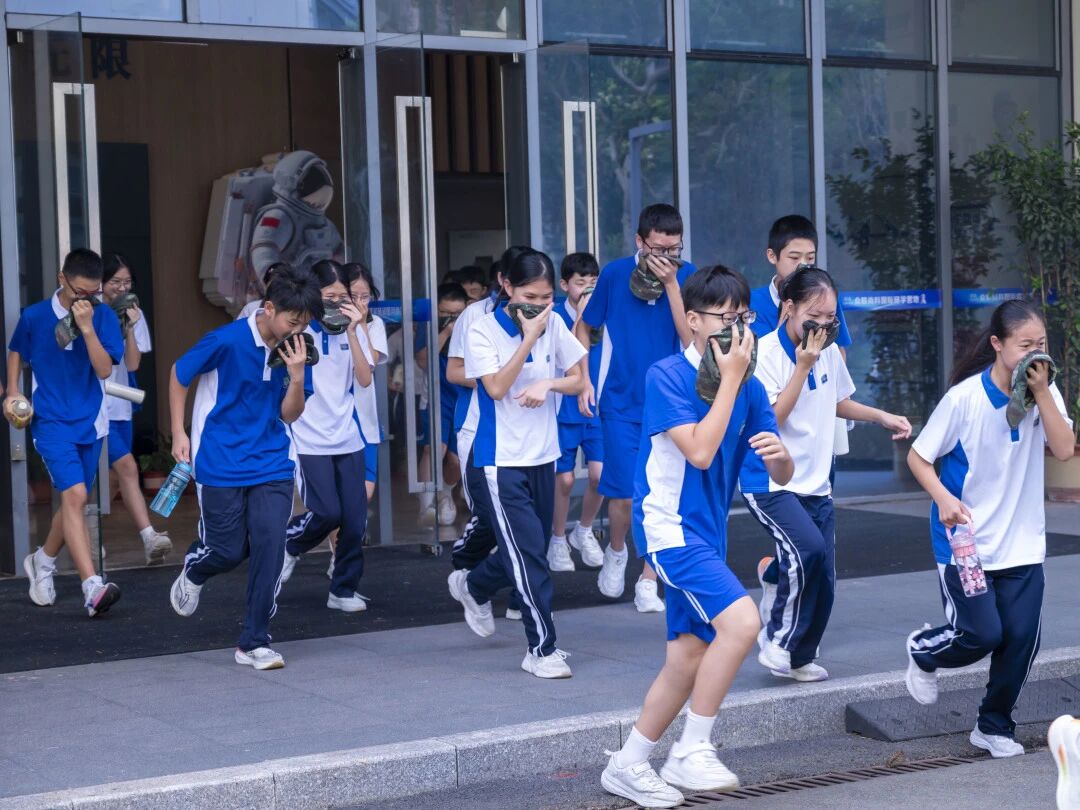 消防疏散演练中,烟雾弥漫,同学们用湿毛巾捂住口鼻,弯腰低姿快速撤离,整个过程井然有序。
