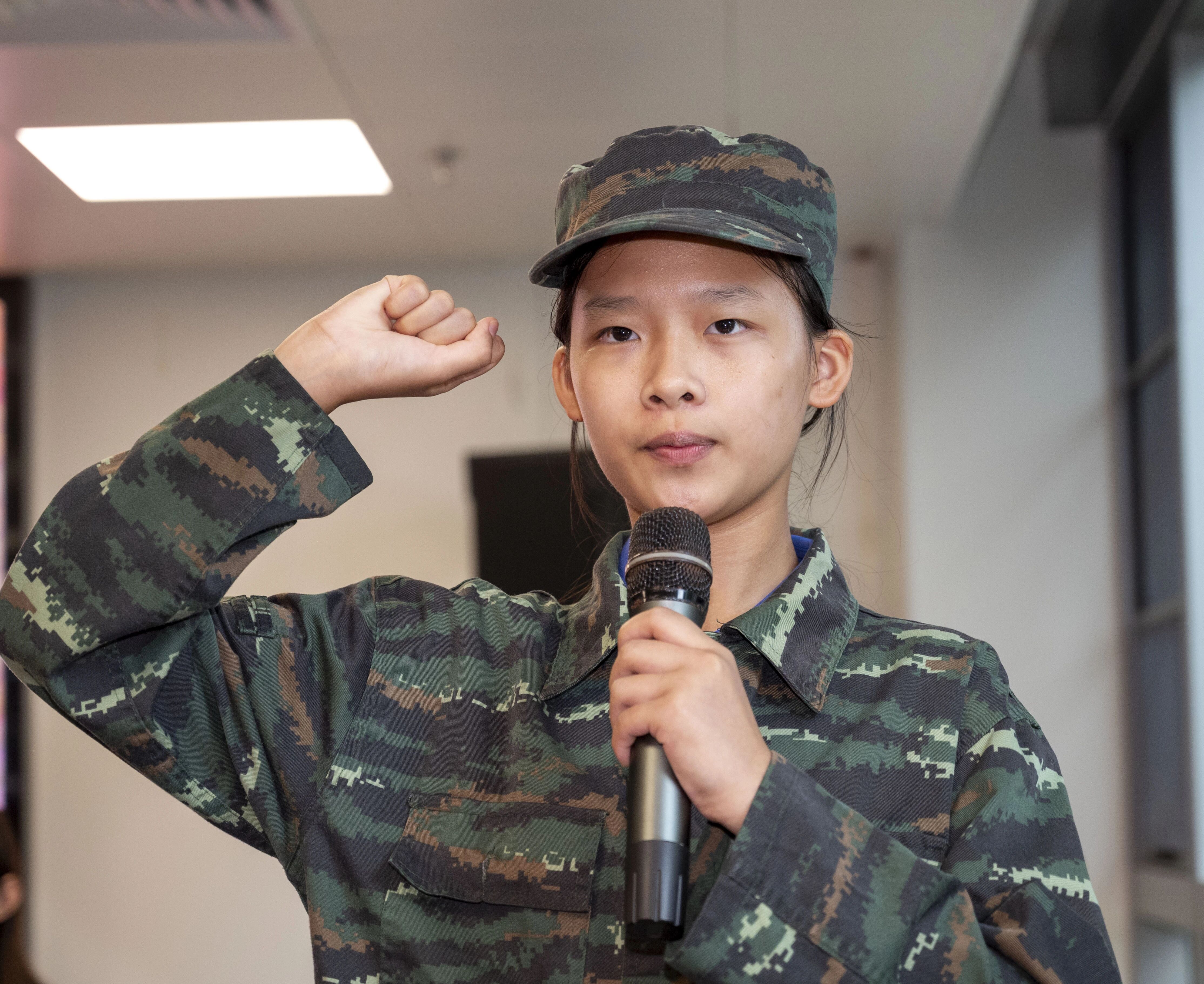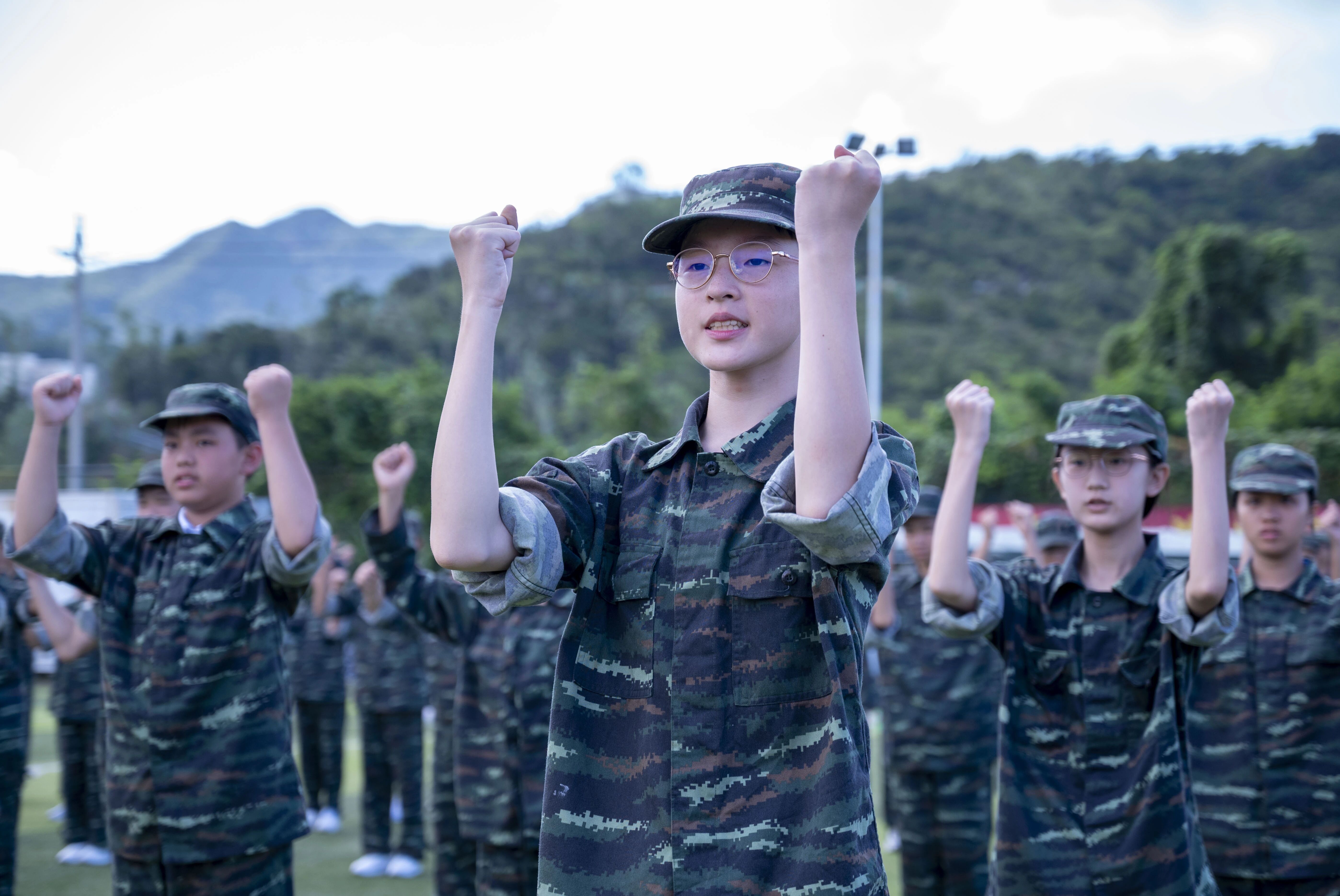 来自八年级(4)班的刘可昕作为学生代表领誓,“遵守纪律,刻苦训练,勇于探索,团结互助……” 学生代表高举右拳,铿锵有力的誓言在营地回荡,学子们齐声跟读。