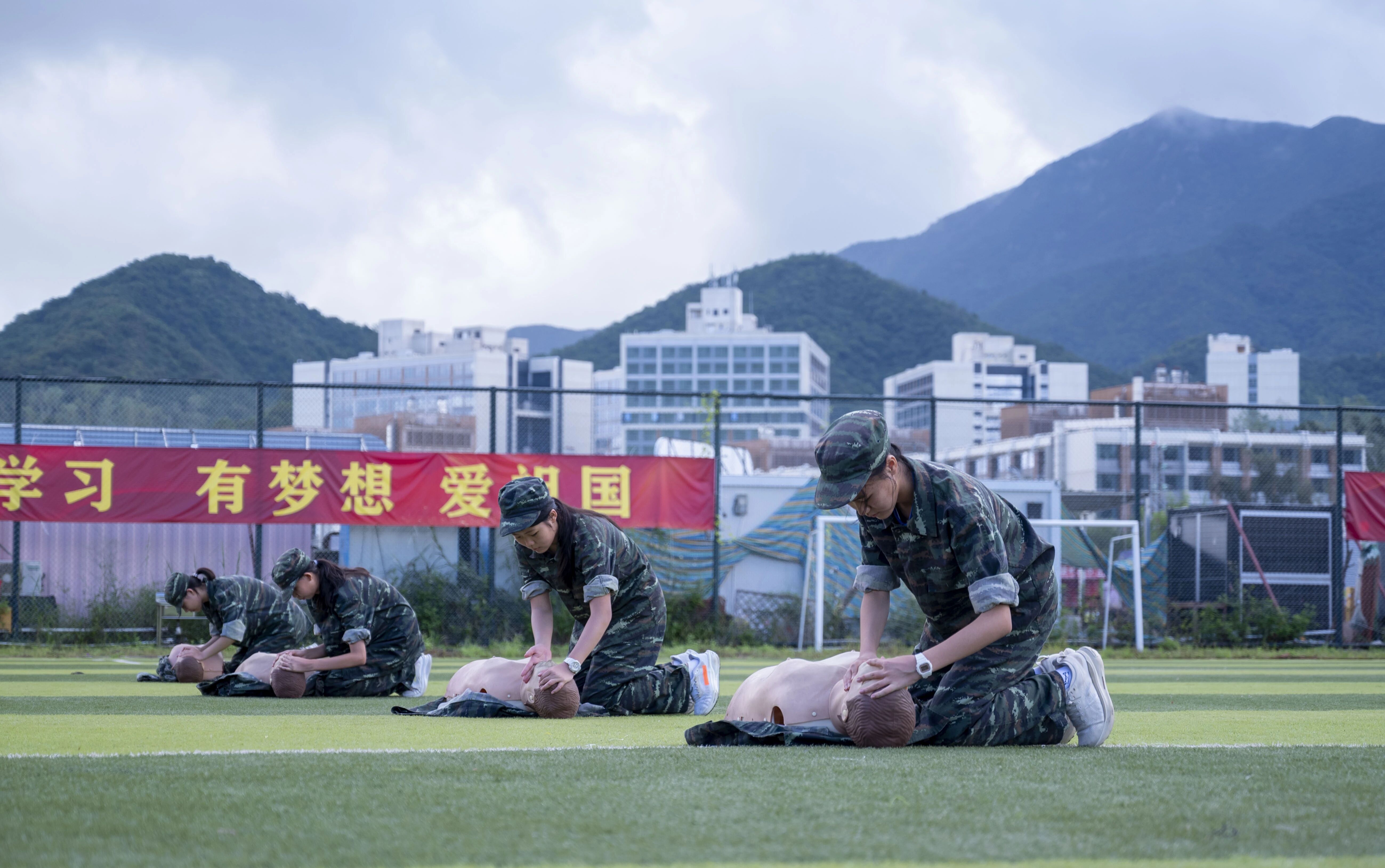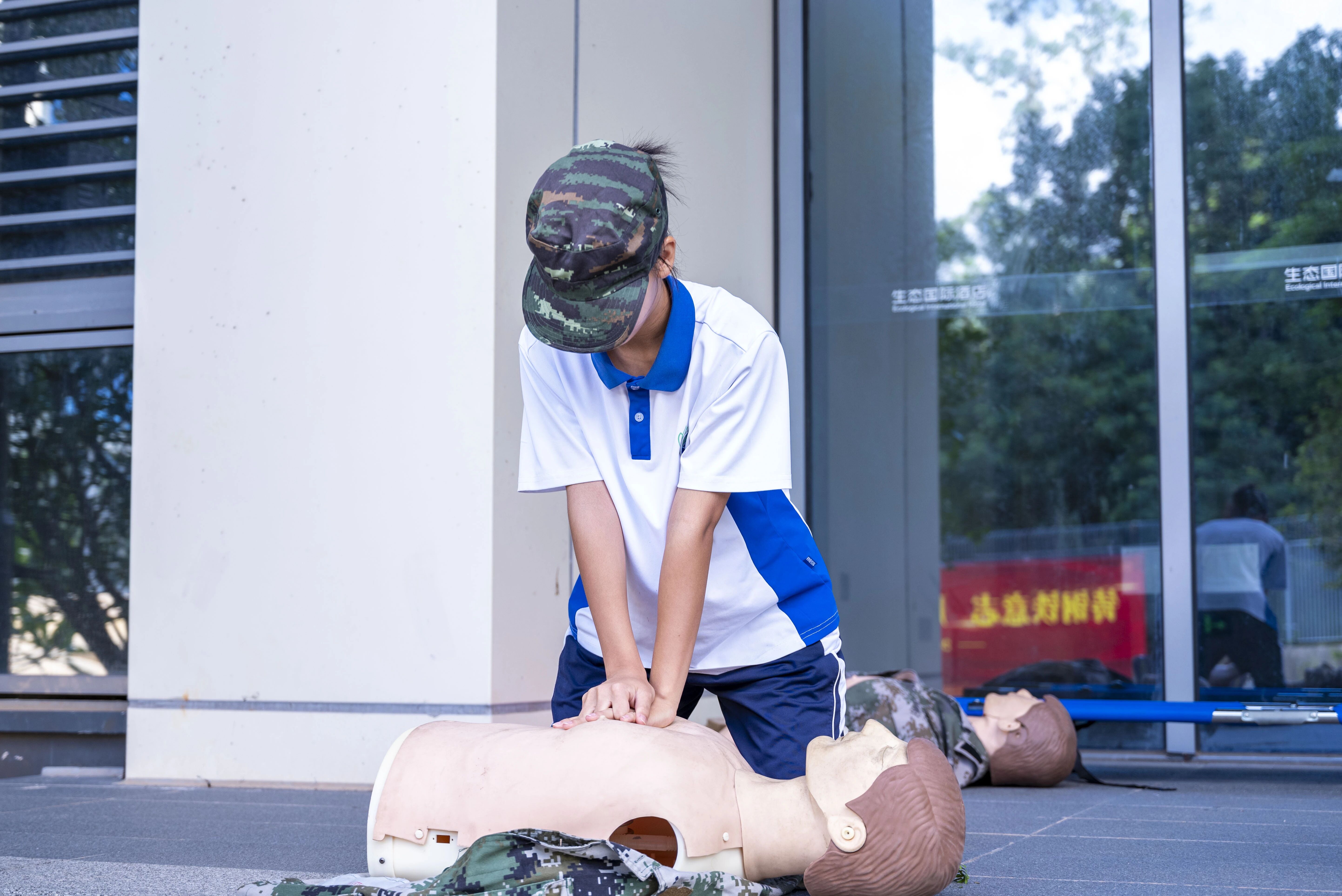 面对模拟人,教官拆解心肺复苏步骤:判断意识、胸外按压、开放气道、人工呼吸。同学们轮流上手实操,从生疏到熟练,紧盯按压位置与节奏,每一次按压都像在与“时间赛跑”,深化同学们对 “生命至上” 的敬畏。
