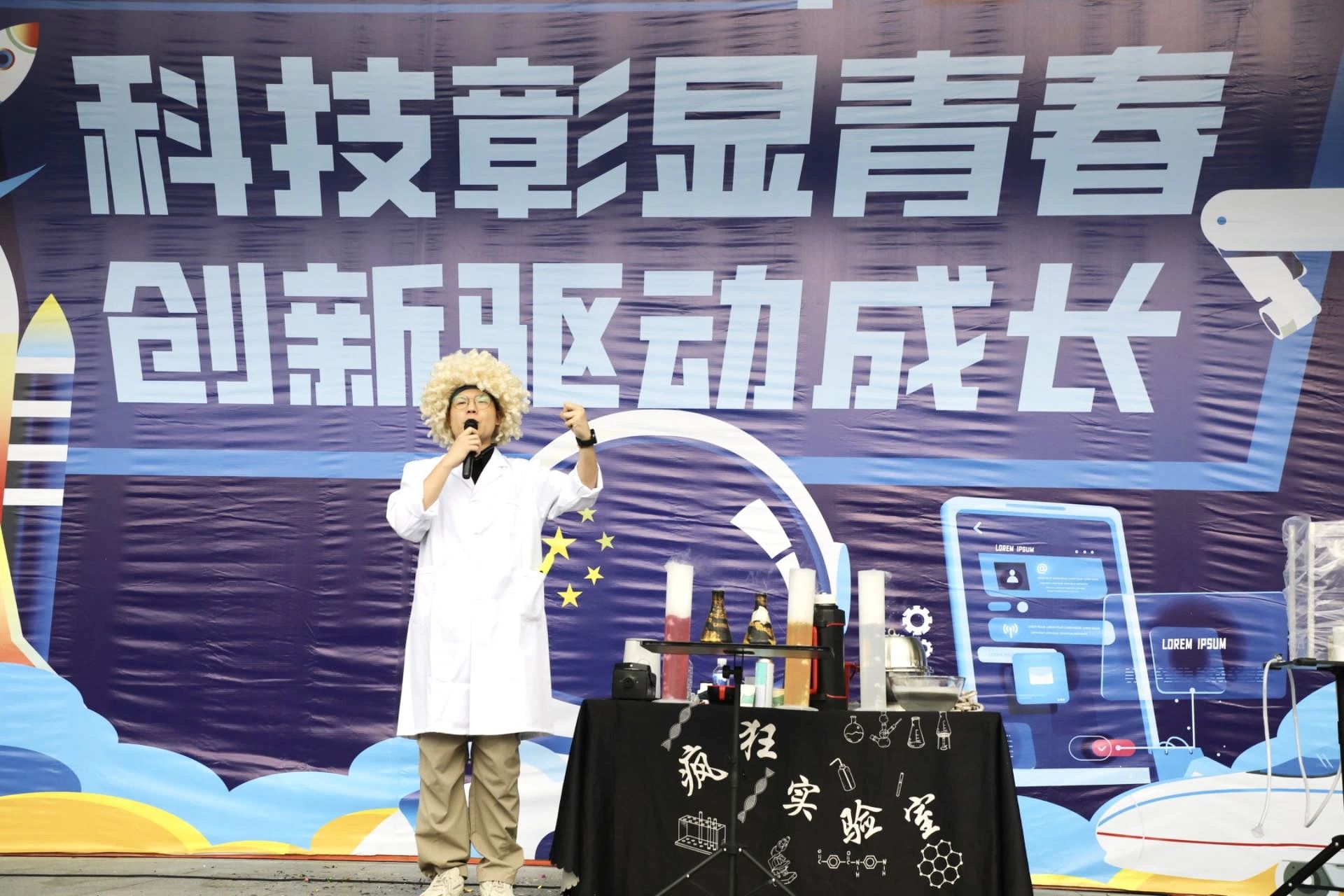 疯狂博士带来的“水火相融”、“掌中火”等精彩表演看似违背常识,却向同学们展示了科学的魅力。水与火的交织,声与色的融合,一个个奇妙的现象在舞台上呈现,让人仿佛置身于一个神奇的科技世界。同学们的阵阵欢呼将开幕式活动推向了高潮,大家纷纷报名上台参与实验,亲身体验奇妙的化学反应。