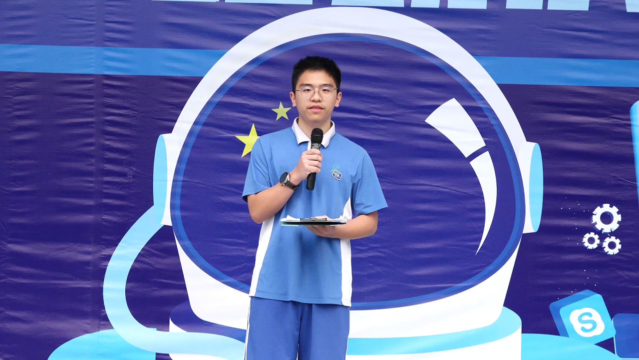 九(1)班梁浚豪同学作为学生代表上台演讲,他用激昂的语言,将自己和队友在全国青少年科技教育成果展示大赛中取得佳绩的经历娓娓道来,展示了我校学子的卓越素质和精神风貌,也体现了“健全人格教育,人人有特长”的实验教育目标。