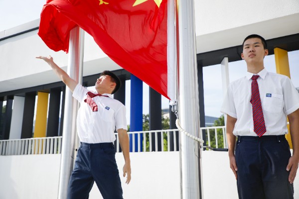 在庄严的升旗仪式中,全体师生高唱国歌和校歌。