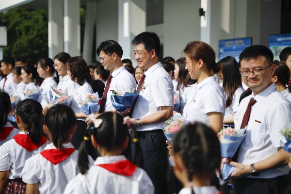 一支粉笔,一颗初心,始于热爱,成于丰盈,幸福就是实验学子笑靥如花的模样。庄重的宣誓环节后,小学部、初中部学生代表用鲜花向可亲可敬的老师们送上了最真挚的祝愿。声声祝福、句句问候,让为人师者心生温暖;张张笑脸、束束鲜花,荣耀的光辉在脸上闪耀。尊师重教的时代风尚,在校园演奏着动人的乐章。老师们的辛勤付出,拨动了实验学子感恩的心弦。