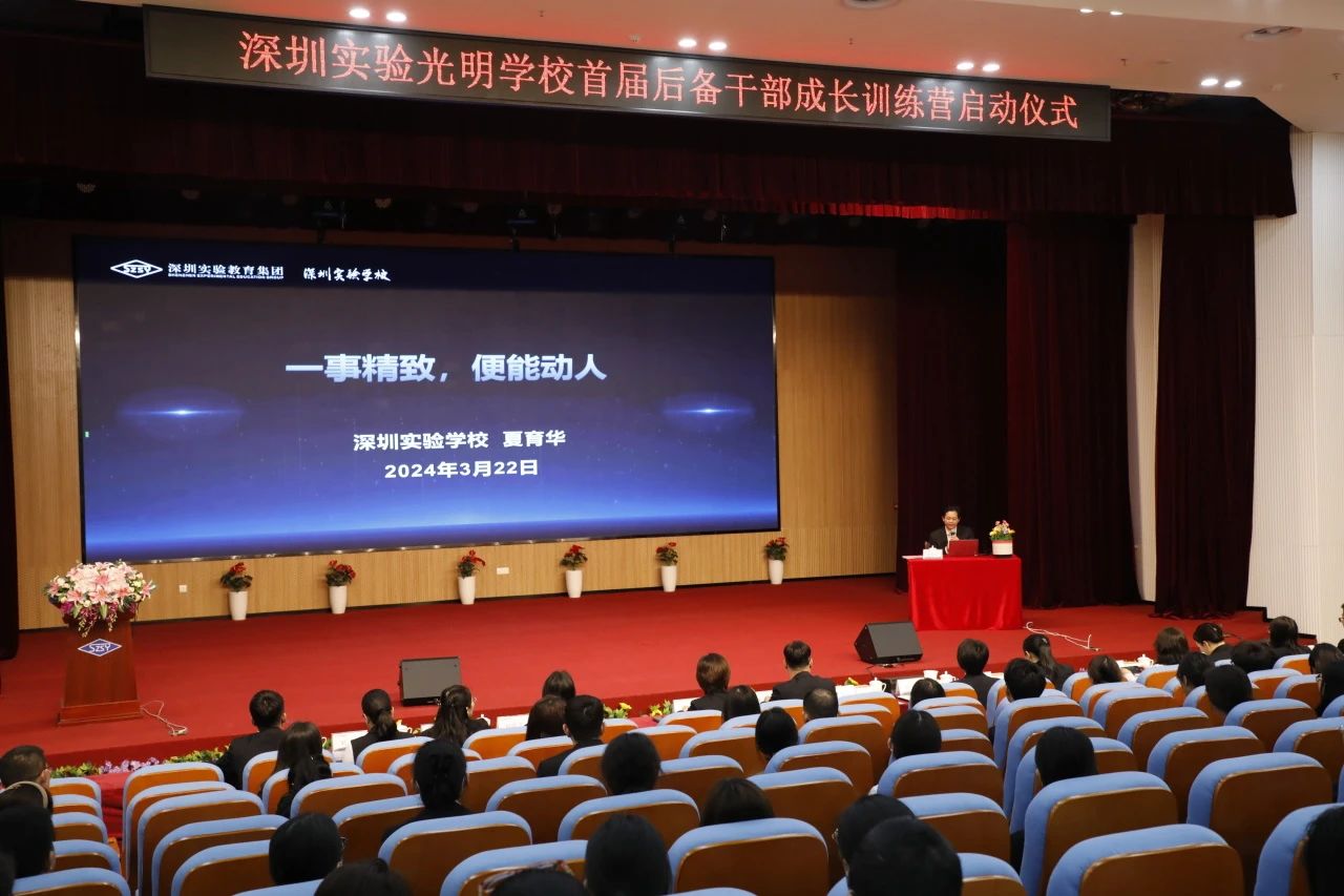 为认真贯彻执行干部队伍年轻化、知识化、专业化的方针,积极培养和造就一支素质优良、数量充足、结构合理的后备干部队伍,2024年3月22日下午,我校召开本学期第二次教职工大会,并举行首届后备干部成长训练营启动仪式。深圳实验学校党委书记夏育华、深圳实验光明学校校长朱灵辉、副书记倪娟、副校长李晨及全体教职工出席本次会议。会议由鞠文轩老师主持。